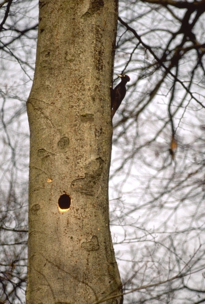 Typisches hochrundes Einflugloch einer neu gezimmerten Nisthöhle in einer Rotbuche In Europa wurden 58 Tierarten festgestellt, die Schwarzspechthöhlen entweder als echte Nachnutzer oder als Höhlenkonkurrenten nutzen. Unter den Vögeln sind das vor allem Hohltaube, Dohle und Star, verschiedene Eulenarten sowie Gänsesäger und Schellente. Auch für Fledermäuse, unter ihnen einige äußerst gefährdete Arten, ist der Schwarzspecht ein wichtiger Höhlenlieferant. Auch andere Säugetiere wie Eichhörnchen, verschiedene Bilche sowie Baummarder verwenden Schwarzspechthöhlen als Brut- oder Schlafhöhlen. Daneben wurden Insekten wie die Hornisse, Bienen, Hummeln und Wespen als Bewohner von Schwarzspechthöhlen festgestellt. Als echte Höhlenkonkurrenten, denen der Schwarzspecht im Regelfall selbst bei frisch gezimmerten Höhlen weicht, treten vor allem Dohle, Marder, Raufußkauz und Waldkauz auf. Gegenüber Hohltaube, Star und kleineren Singvogelarten beziehungsweise kleineren Spechten, wie Grau- oder Grünspecht, behauptet sich meist der Schwarzspecht. Die Bedeutung des Schwarzspechtes als Höhlenlieferant wurde während der Erstbesiedelung Bornholms eingehend studiert. 1966 gelang der erste Brutnachweis. Bis Mitte der 1980er Jahre brüteten auf der Ostseeinsel 36 Paare, zusätzlich wurden einige Nichtbrüter beobachtet. Insgesamt wurden in dieser Zeit fast 2000 Höhlen gezimmert. Während dieser 20 Jahre nahm der Dohlenbestand signifikant zu, Hohltaube und Raufußkauz wurden als neue Brutvogelarten festgestellt.