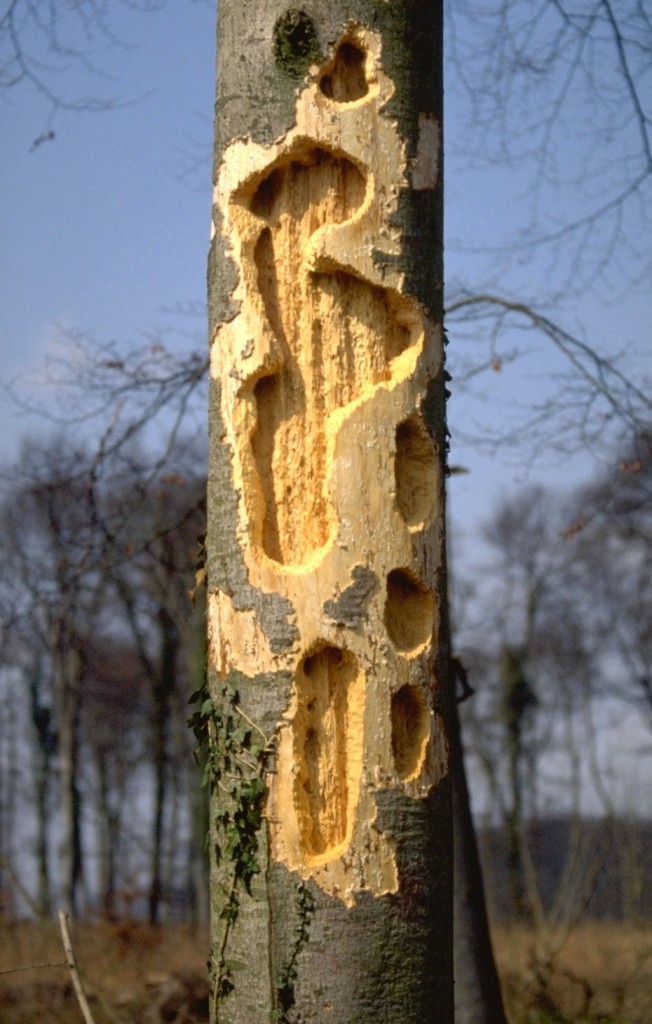 Weiblicher Schwarzspecht bei der Nahrungssuche Schwarzspechte ernähren sich zum überwiegenden Teil von Insekten, vornehmlich von Ameisen. Der Anteil pflanzlicher Nahrung ist unbedeutend, gelegentlich werden jedoch Früchte und Beeren sowie Koniferensamen aufgenommen. Unter der Ameisenbeute überwiegen große Arten, wie Imagines, Puppen und Larven von Rossameisen(Camponotus sp.), Waldameisen (Formica sp.), Wegameisen (Lasius sp.) sowie Vertreter der Knotenameisen, insbesondere solche der Gattung Myrmica. Die Ameisenbeute kann, jahreszeitlich schwankend, über 90 Prozent der Gesamtnahrung betragen; im Sommer überwiegen holzbewohnende Arten, während im Winter vor allemAmeisenhaufen von Formica–Arten ausgebeutet werden. Auch die Nestlingsnahrung besteht zu einem sehr hohen Prozentsatz aus Ameisen, insbesondere aus Rossameisen. Wo diese Ameisen nicht vorkommen, wie etwa in Holland, werden andere Arten zur Hauptnahrung, zum Beispiel Waldameisen. Neben der Ameisennahrung bilden verschiedene holzbewohnende Käfer und deren Entwicklungsstadien, so etwa Borkenkäfer (Scolytinae) und Bockkäfer (Cerambycidae), wichtige Nahrungsbestandteile. Bei Massenauftreten können die Larven der Holzwespe (Urocerus gigas) sowie verschiedene andere Insektenarten bedeutsam werden. Nur relativ selten finden sich Reste von Zweiflüglern, Schmetterlingen, Spinnen und kleinen Schnecken in den Nahrungsanalysen. Nur ausnahmsweise scheinen Schwarzspechte Wirbeltiere wie Molche beziehungsweise Nestlinge und Eier anderer Höhlenbrüter zu verzehren. Gelegentlich suchen Schwarzspechte Ringelstellen anderer Spechte auf oder ringeln im Frühjahr selbst. Nahrungserwerb Typische großflächige, oft rechteckige Hackspuren des Schwarzspechtes Der Schwarzspecht lebt während des Frühjahrs, Sommers und Frühherbstes vor allem von holz- oder totholzbewohnenden Ameisenarten, deren Gänge und Nester mit wuchtigen Schlägen freigelegt werden. Typische Hackspuren der Art weisen längliche, oft rechteckige Umrisse auf und können sehr tief ins Holz vordringen. Ebenso löst der Schwarzspecht große Rindenflächen, um an darunter lebende Insekten zu gelangen. Im Spätherbst und Winter werden vor allem die Nester von Formica-Arten (Waldameisen) aufgesucht, deren Haufen er öffnet und ausbeutet. An einem Haufen können gelegentlich mehrere Schwarzspechte, manchmal gemeinsam mit Grün- oderGrauspechten beobachtet werden. Selbst bei starkem Frost und Schneelagen bis zu einem Meter vermögen Schwarzspechte Ameisenhügel zu öffnen. Unter den Nahrungsbäumen können sich beachtliche Mengen abgeschlagener Holzspäne finden. Hier bei einer Fichte(Picea abies)
